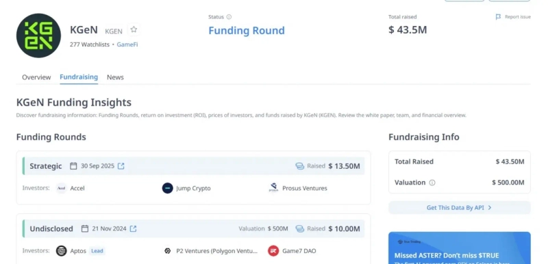 Based on strong founder backgrounds and vision, KGeN has raised about $43.5 million in cumulative investments from global VCs such as Accel, Prosus Ventures, and Jump Crypto, as well as strategic partners like Aptos Labs and Polygon, and in a recent round it was valued at approximately $500 million.