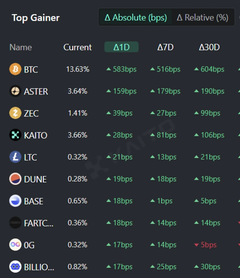 According to Token Mindshare, the token metric of AI-based Web3 search platform Kaito (Token Mindshare, a metric that quantifies the influence of specific tokens within the virtual asset (cryptocurrency) market) top gainer, as of the 6th the top five virtual asset-related keywords people are most interested in are Bitcoin (BTC), Aster (ASTER), Zcash (ZEC), Kaito (KAITO), and Litecoin (LTC).
