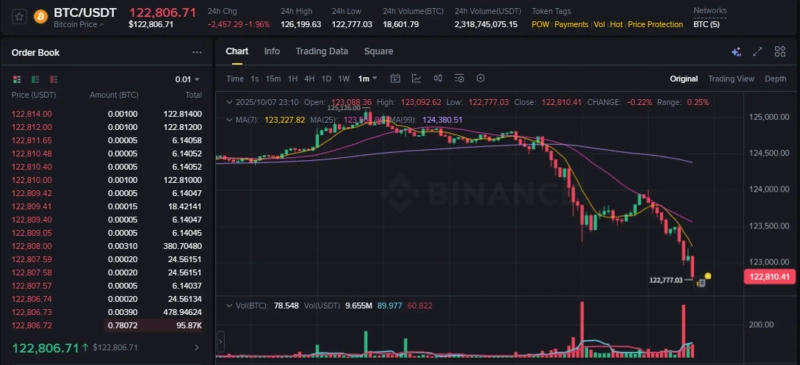 As of 11:11 PM on the 7th (local time), based on the Binance USDT market, Bitcoin is trading at $122,806, down 1.96% from 24 hours earlier.