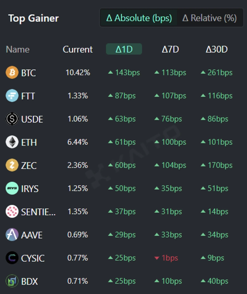 - According to Kaito's Token Mindshare data, the crypto assets that recently received the most attention were Bitcoin, FTX Token, USDE, Ethereum, and Zcash.