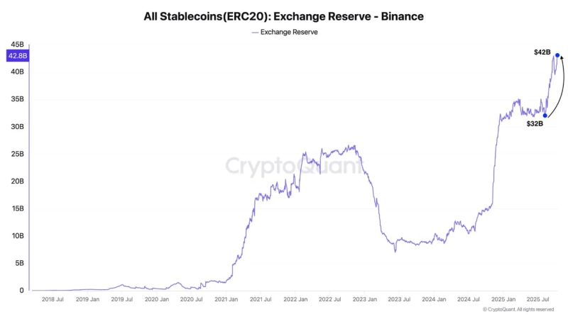 On the 13th (Korean time), CryptoQuant contributor Dark Post analyzed in a report that "over the past two months, the supply of ERC-20 stablecoins on Binance increased from $32 billion to $42 billion."