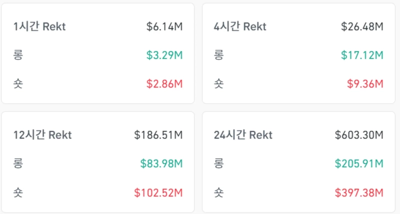 According to CoinGlass data on the 13th (local time), a total of $603.3 million in futures positions were liquidated in the crypto asset market over the past 24 hours. Specifically, $205.91 million in long positions were liquidated, and $397.38 million in short positions were liquidated.
