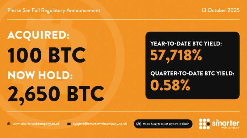 This brings Smarter Web Company's total Bitcoin holdings to 2,650. The average purchase price is 109,984 dollars.