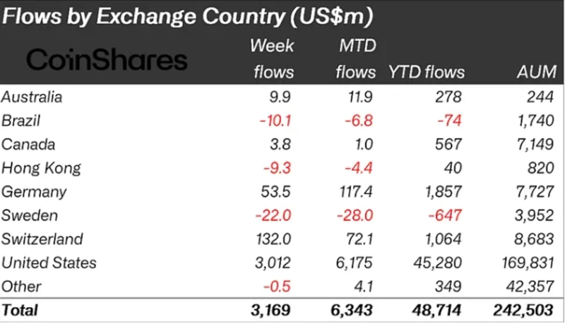 By country, U.S.-origin inflows were strong. U.S.-based crypto products alone saw net inflows of about $3.012 billion, and Germany and Switzerland saw inflows of $53.5 million and $132 million, respectively. Meanwhile, Sweden and Hong Kong saw outflows of $22 million and $9.3 million, respectively.