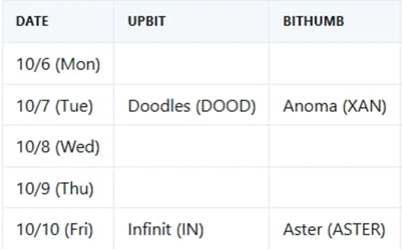 Last week, Upbit added Doodles and Infinit, and Bithumb listed Anoma and Aster, continuing a new listing parade. On Upbit, XRP ($3.09 billion), BTC ($2.89 billion), and ETH ($2.75 billion) accounted for the bulk of trading volume, maintaining a clear lead in market activity. Also among the top ranks were USDT ($2.2 billion) and SOL ($1.33 billion), while DOGE, IN, and XPL recorded trading volumes ranging from $516 million to $1.22 billion. Despite reduced volume due to the Chuseok holiday, activity was broadly distributed across large-cap and mid-cap assets such as DOOD, MNT, ZKC, and ADA, indicating steady retail participation.
