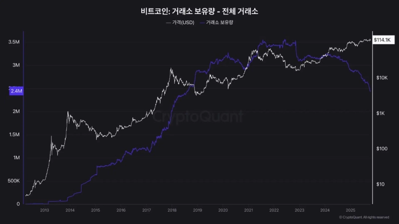 On the 14th (Korean time), CryptoQuant contributor Chairman Lee said in a report, "The amount of Bitcoin held in custody on centralized exchanges is estimated at 2.4 million," and analyzed, "This is a significant reduction compared to 3.5 million in 2020 and is the lowest level in the past 10 years."