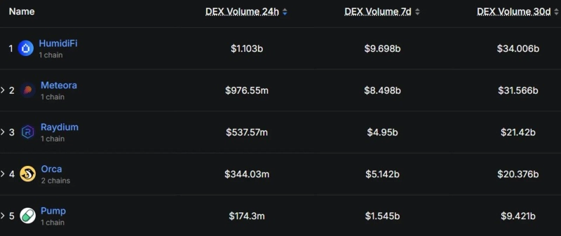 - HumidiFi was reported to have become the No.1 DEX on the Solana network, recording a 24-hour trading volume of US$1.1 billion and US$34 billion over 30 days.