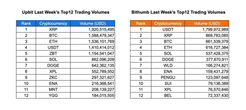 Last week Upbit's total trading volume continued to outpace Bithumb, maintaining a strong lead in major assets. XRP led Upbit at $1.92 billion, followed by BTC at $1.59 billion, ETH at $1.54 billion, and USDT at $1.41 billion, demonstrating investors' strong interest in large-cap assets. Mid-cap tokens such as ZBT ($1.15 billion), SOL ($862 million), and DOGE ($642 million) also recorded steady volumes, and emerging tokens like ENA and MNT ranked highly, reflecting ongoing retail interest in new listings.