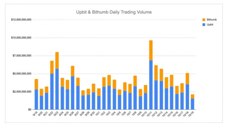 Overall, both exchanges experienced a surge in volume between October 10 and 12, when the combined daily volume briefly exceeded $10 billion before normalizing over the weekend. Upbit maintained a high contribution to trading throughout this period, reinforcing its position as the nation's largest retail-focused exchange. Bithumb's volume spike appeared concentrated around altcoin price movements and liquidity inflows.