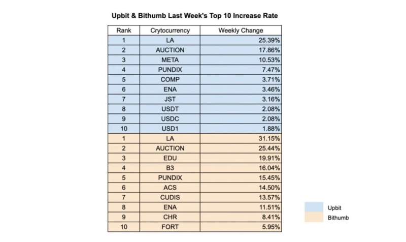 LA led both Upbit and Bithumb, posting the week's highest gains. Upbit recorded a 25.39% rise, and Bithumb recorded a 31.19% rise, driven by renewed retail speculation and increased liquidity inflows. On Upbit, AUCTION (+17.86%) and META (+10.53%) posted notable gains aided by steady volume and mid-cap momentum. Other tokens such as PUNDIX (+7.47%), COMP (+3.71%), and ENA (+3.16%) saw small gains, while stablecoin pairs like USDT, USDC, and USD1 showed modest increases reflecting market stability rather than speculative demand.