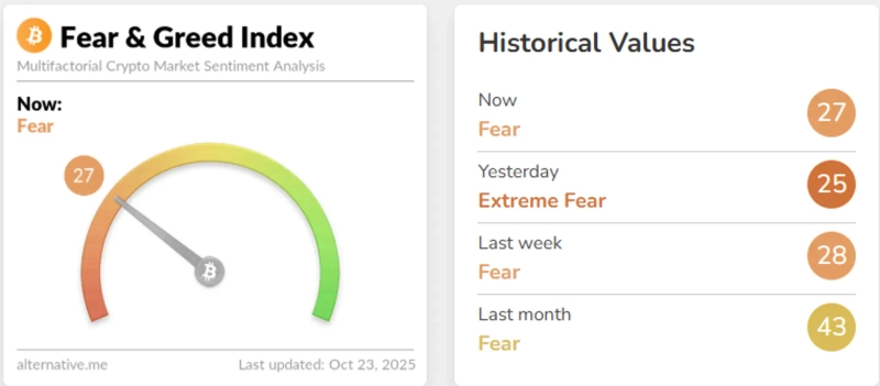On the 23rd (local time), the Fear and Greed Index provided by cryptoasset analytics firm Alternative is currently 27 out of 100, entering the 'Fear' phase. The index rose 2 points from the previous day (25 points), showing a slight improvement in market sentiment.