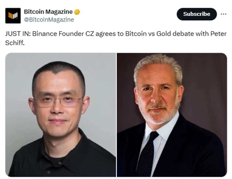 Changpeng Zhao (CZ), the founder of Binance, has agreed to a public debate with Peter Schiff, a prominent advocate of gold investments, on the topic of 'Bitcoin (BTC) vs gold'.