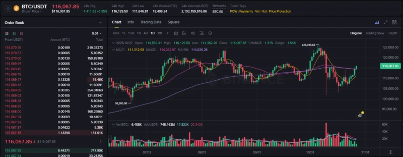 At 4:05 p.m., on the Binance USDT market, Bitcoin is trading at $116,067, up 3.95% from 24 hours earlier.