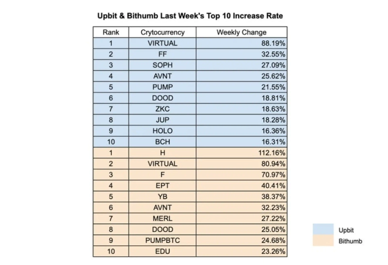 VIRTUAL recorded a weekly gain of 88.19%, dominating the Upbit market. This reflects strong retail interest and speculative trading momentum. FF (+32.55%) and SOPH (+27.09%) showed strength supported by steady volumes and short-term buying. Mid-cap tokens like AVNT (+25.62%) and PUMP (+21.55%) also posted notable gains, while DOOD, ZKC, and JUP showed modest but steady rises of 18–19% as liquidity rotated into small-cap assets. HOLO and BCH appeared in Upbit's top 10, suggesting a broader price recovery across altcoins.
