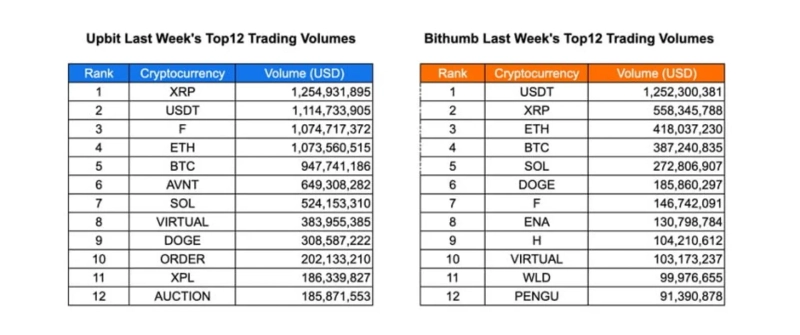 Upbit led overall trading activity last week, surpassing Bithumb, driven by strong demand for large-cap assets. XRP ranked first on Upbit charts with USD 1.25 billion in volume, followed closely by USDT (USD 1.11 billion) and F (USD 1.07 billion), all showing steady liquidity throughout the week. ETH and BTC were also among the most traded tokens, while mid-cap coins such as AVNT (USD 649 million) and SOL (USD 524 million) maintained moderate participation. Newly listed coins like VIRTUAL, ORDER, and AUCTION also secured notable positions, indicating continued retail interest in emerging tokens.