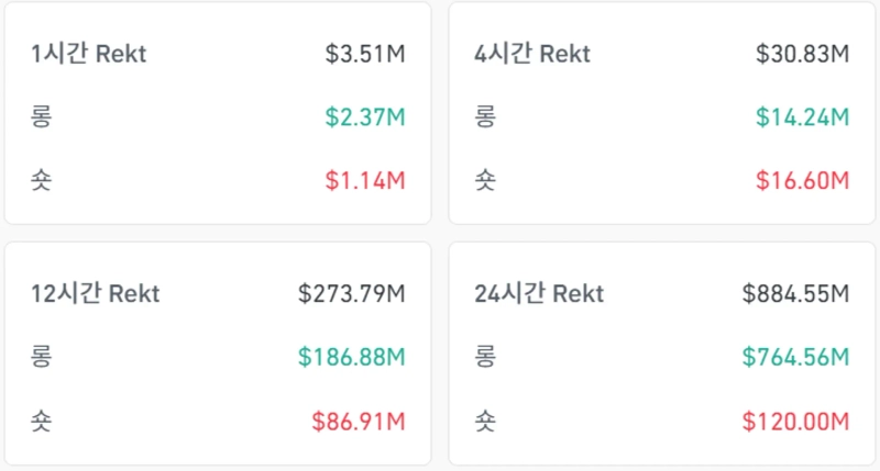 According to CoinGlass data on the 31st (local time), a total of 884,550,000 dollars worth of futures positions were liquidated in the crypto asset market over the past 24 hours. Specifically, long positions worth 764,560,000 dollars were liquidated, and short positions worth 120,000,000 dollars were liquidated.